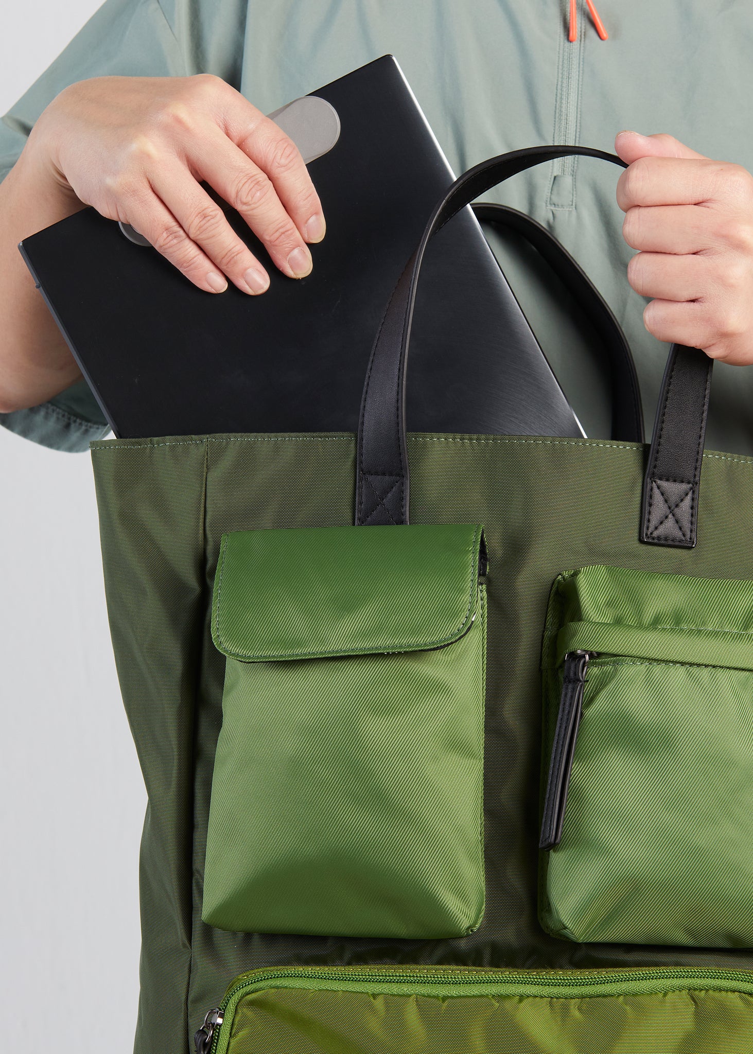Tote bag features a multipocket construction, detailed with hues of green color, crafted from PU which is both light weight and water resistance; complete with one flap pockets and two zip pockets.